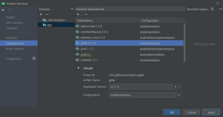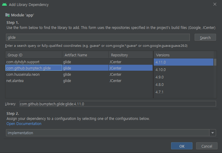 'glide' 입력>Search>com.github.bumptech.glide>최신버전>OK