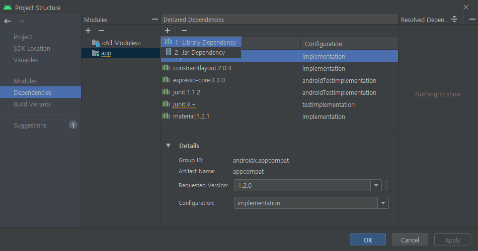 구글링해 찾은 블로그나 공식 설명글에서 써있는 것처럼 Gradle등에 직접 추가하는 방법이 있지만 최근 버전을 추가하기 힘들기 때문에 android studio에서 자동으로 검색 및 설치해주는 기능을 사용한다.