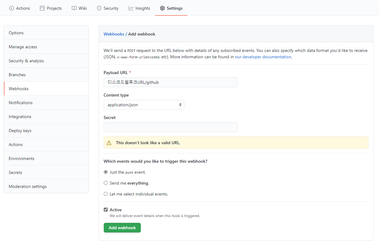 2. 깃허브 레포지토리에서 웹후크 만들기