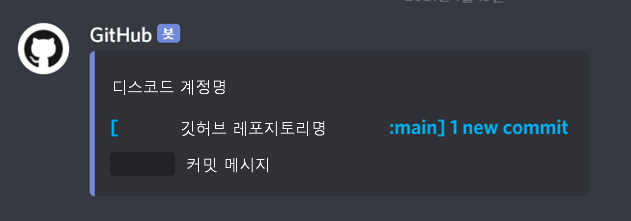 push이벤트에만 반응하도록 웹후크 설정을 했다면 깃허브에 푸시를 할 때 푸시한 커밋 정보가 자동으로 디스코드 메세지로 온다.