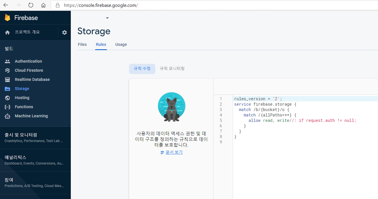 firebase>프로젝트>Storage>Rules