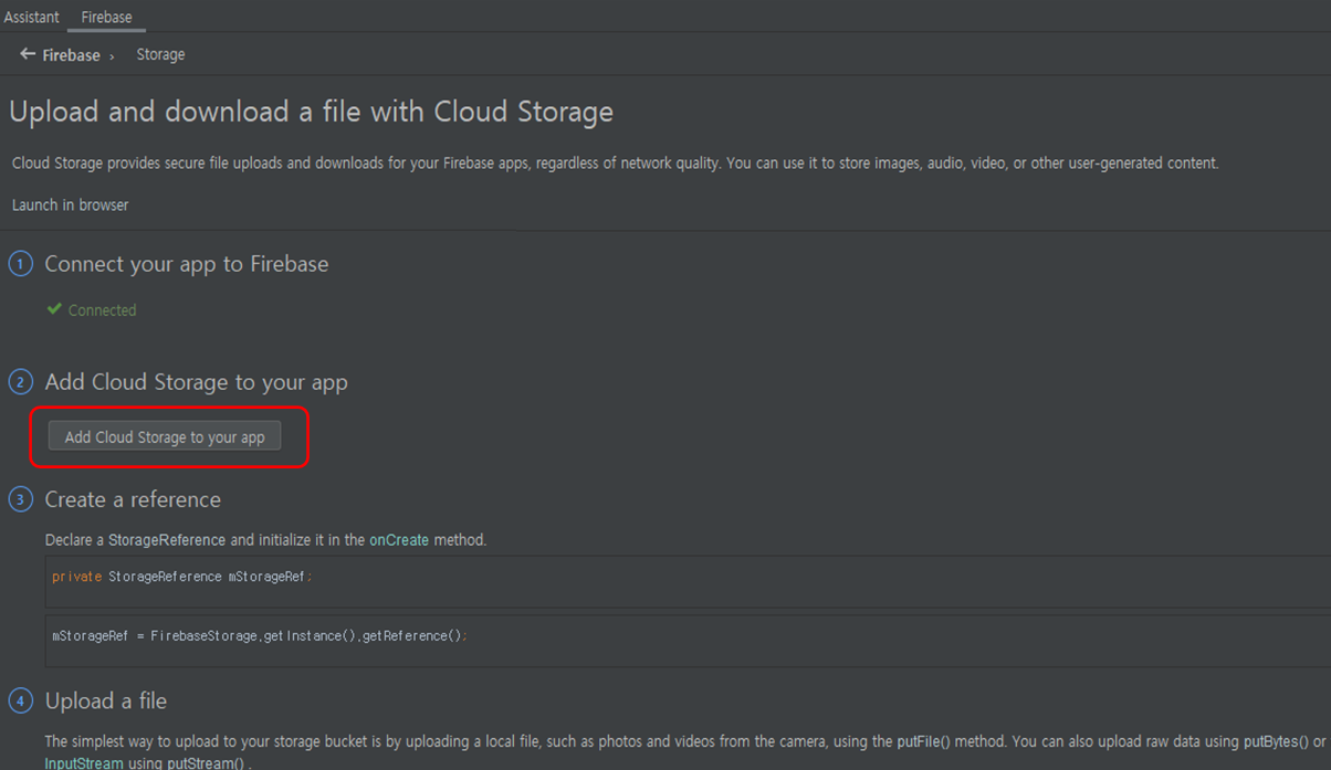 AndroidStudio>Tools>Firebase>Storage>Add Cloud Storage to your app