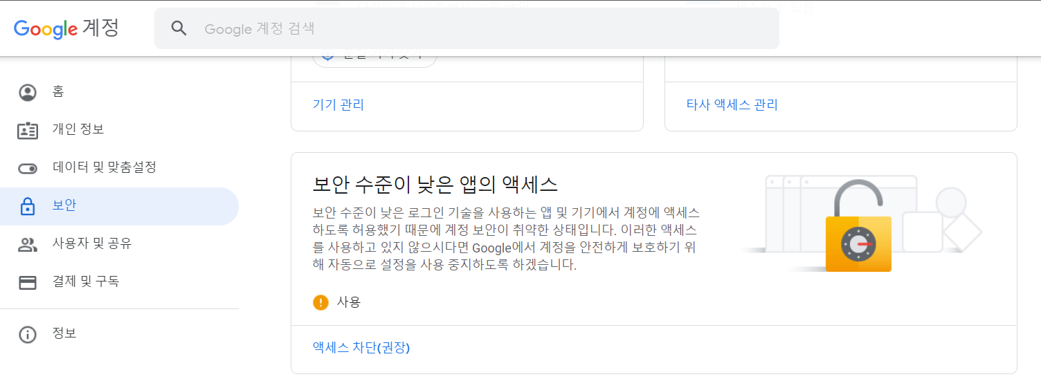 Google 계정 관리 > 보안 > 보안수준이 낮은 앱의 액세스