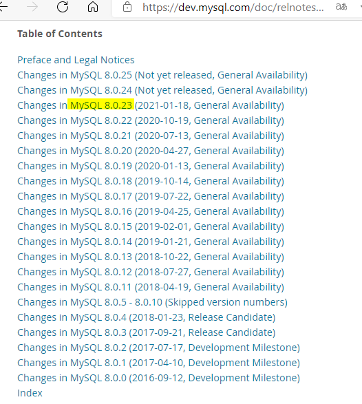 원하는 버전을 선택한다. 최신 버전 확인하기 (21.02.12 기준 MySQL 8.0.23)
